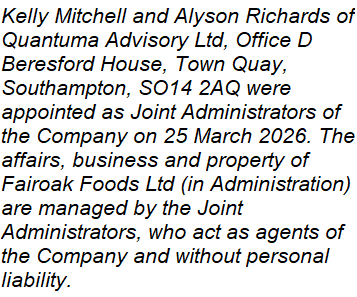 Kelly Mitchell and Alyson Richards of Quantuma Advisory Ltd, Office D Beresford House, Town Quay, Southampton, SO14 2AQ were appointed as Joint Administrators of the Company on 25 March 2026. The affairs, business and property of Fairoak Foods Ltd (in Administration) are managed by the Joint Adminis